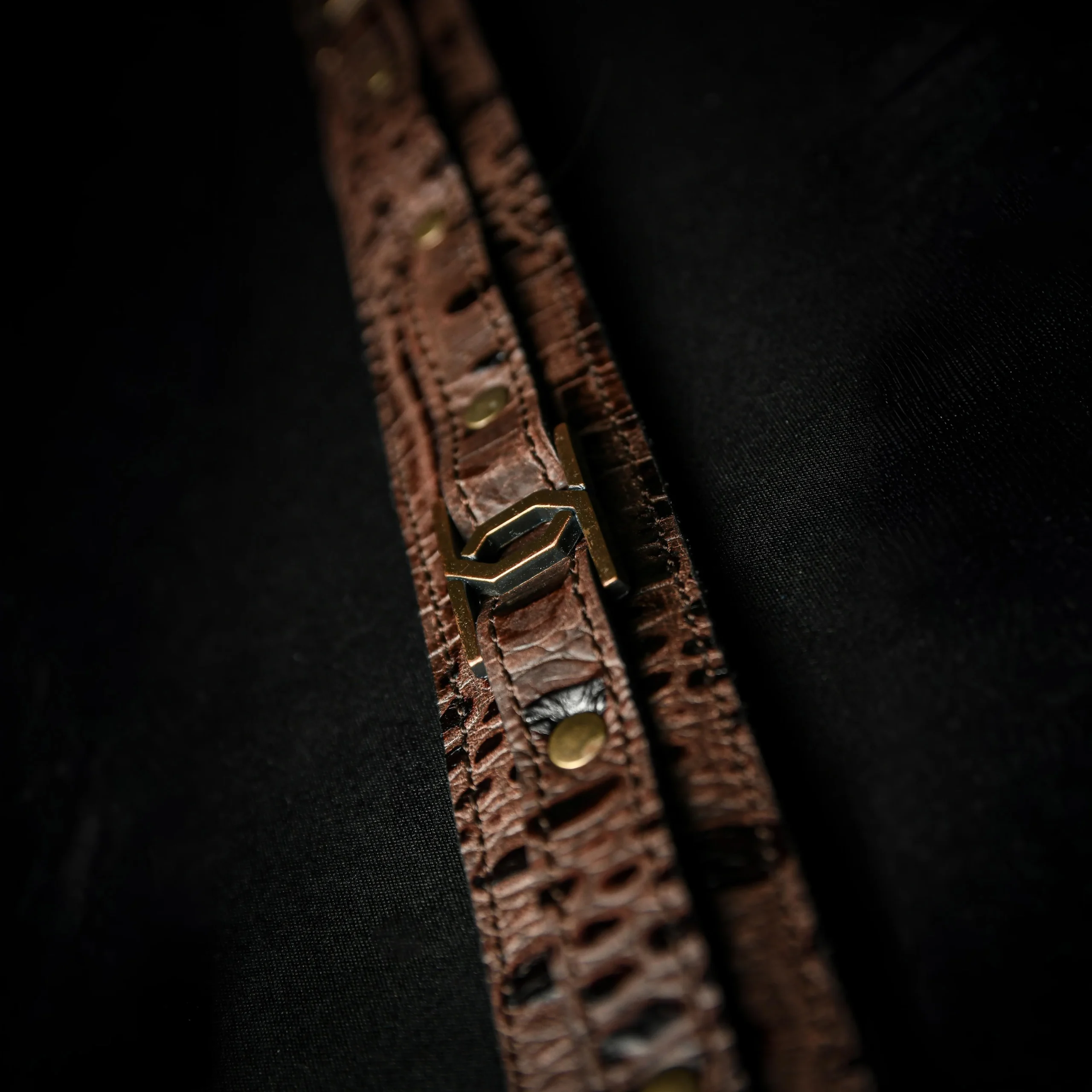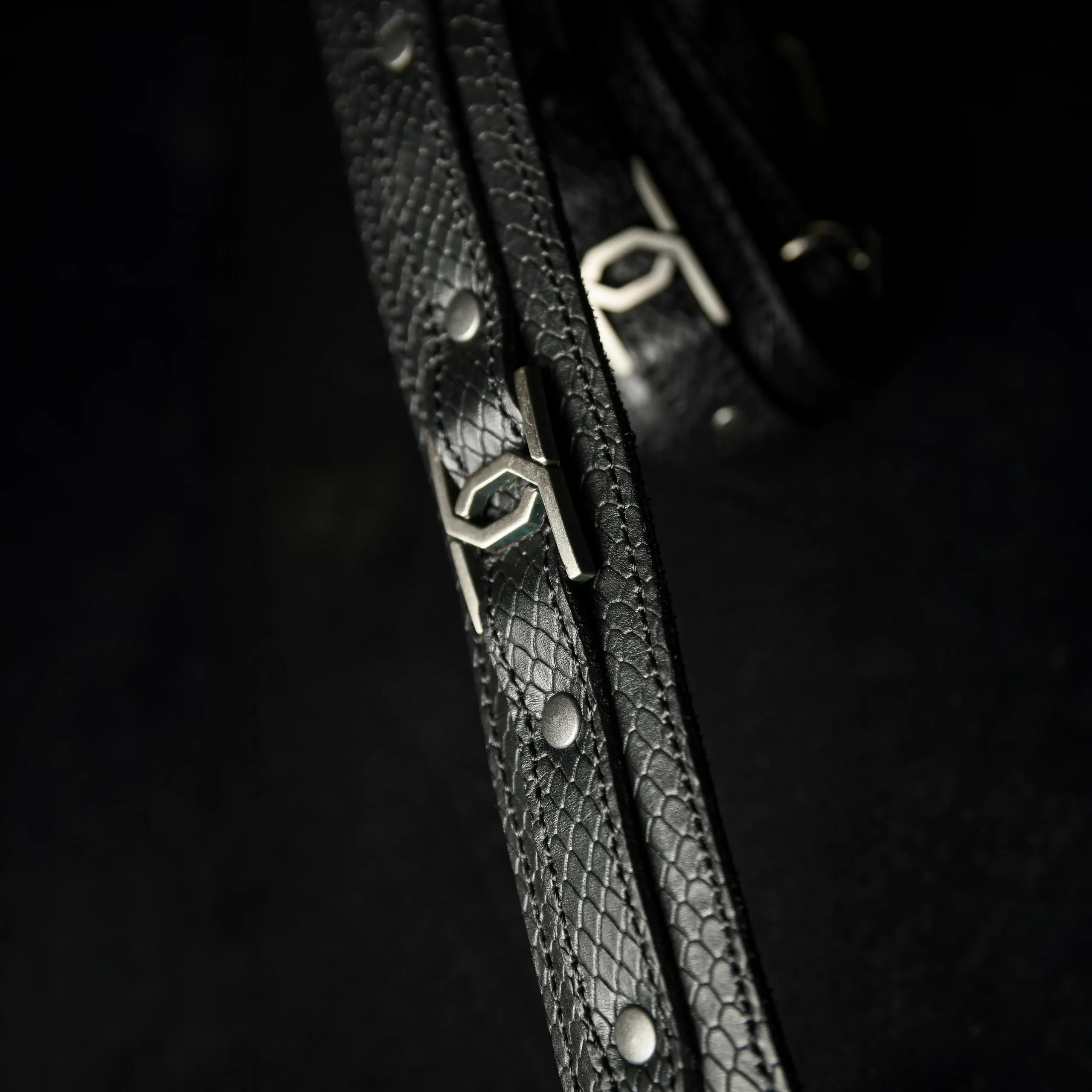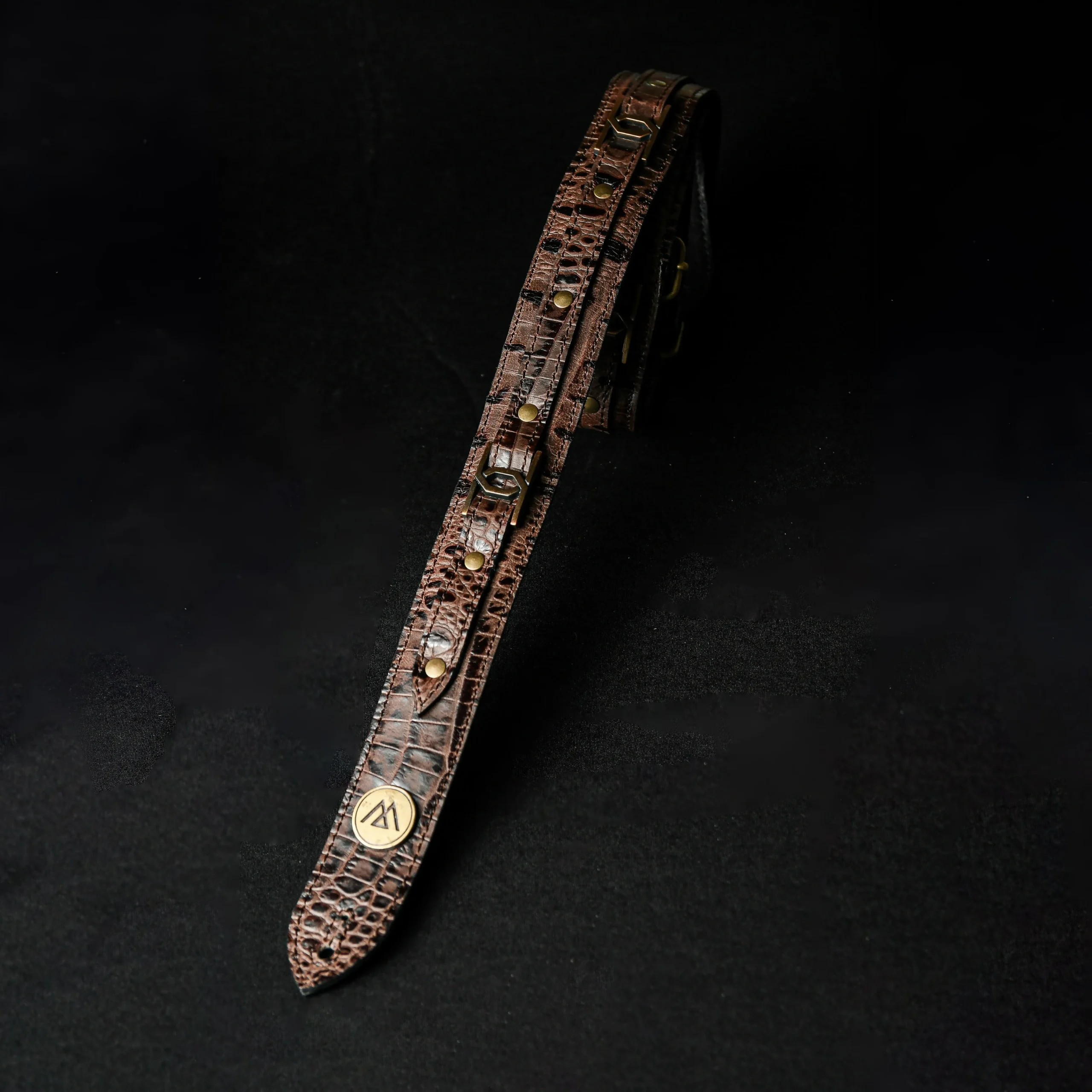 Versión especial del modelo Midori en cuero vacuno escamado tipo lagarto. Disponible en 4 cm de ancho, en marrón con herrajes bronce o negro con herrajes plata. Regulable entre 1,10 y 1,45 m. Doble capa de cuero para mayor resistencia y confort.