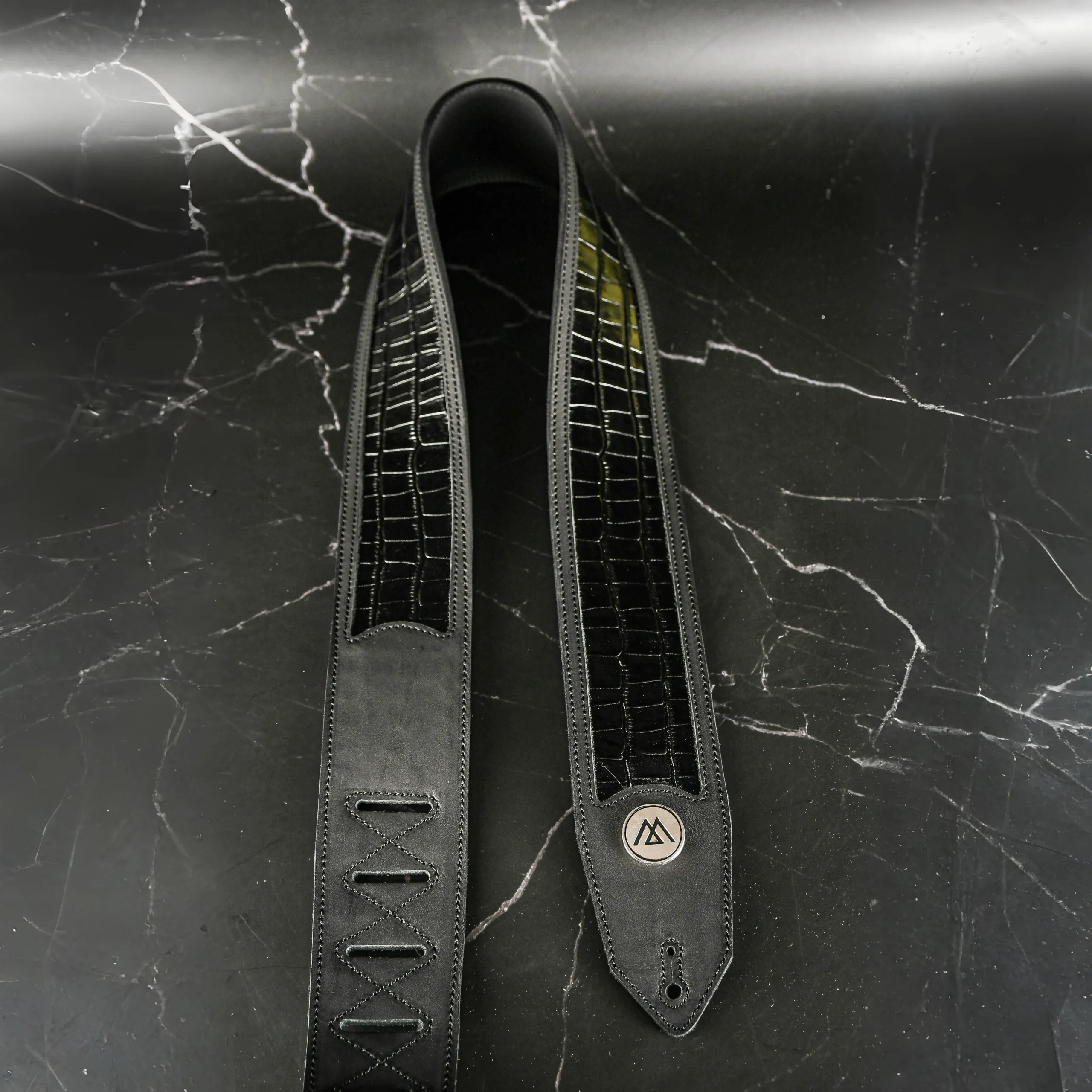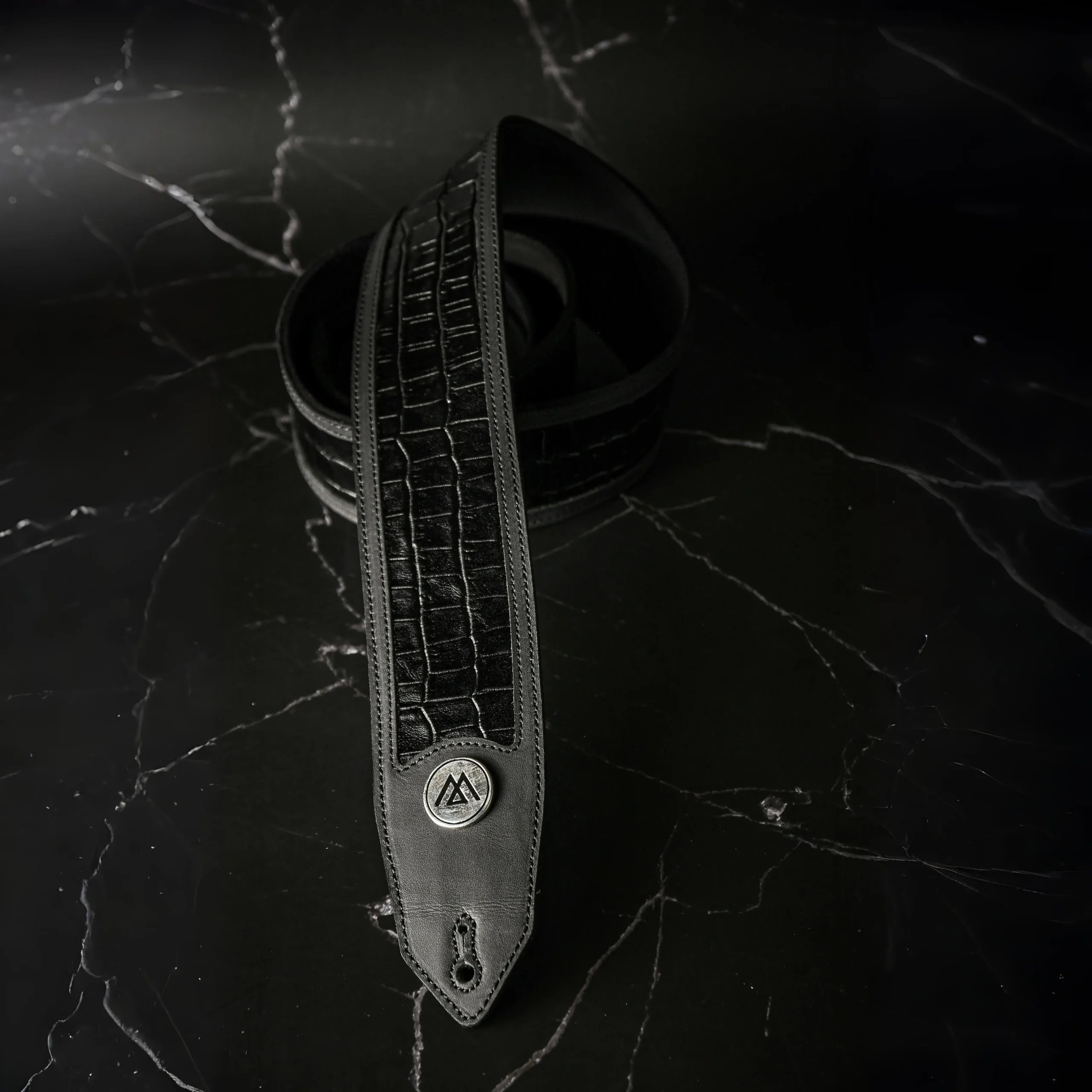 La Modern Croco está hecha 100 % en cuero vacuno de altísima calidad, con una superficie central de textura tipo cocodrilo en tono negro brillante. El relieve marcado del cuero genera un efecto visual sobrio pero impactante, ideal para destacar en escena sin perder elegancia. Esta correa de 6 cm de ancho y hasta 1,40 m de largo combina dos lonjas cosidas con precisión, lo que le da gran flexibilidad, ligereza y suavidad al tacto. No tiene acolchado interno, lo que la vuelve liviana pero robusta. Los refuerzos en puntera y regulador completan una pieza duradera, con estética clásica y sofisticada.