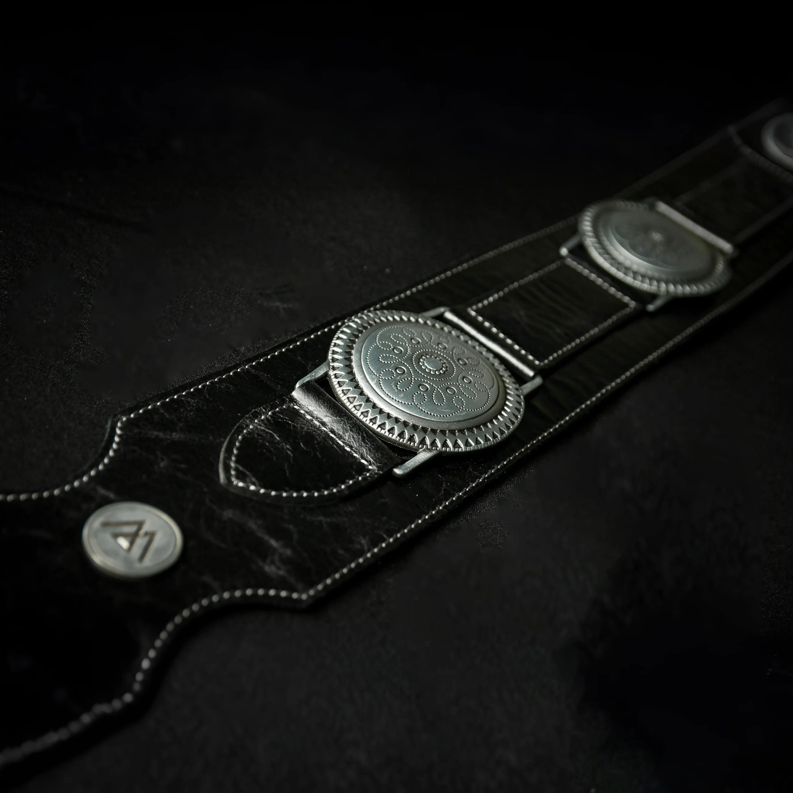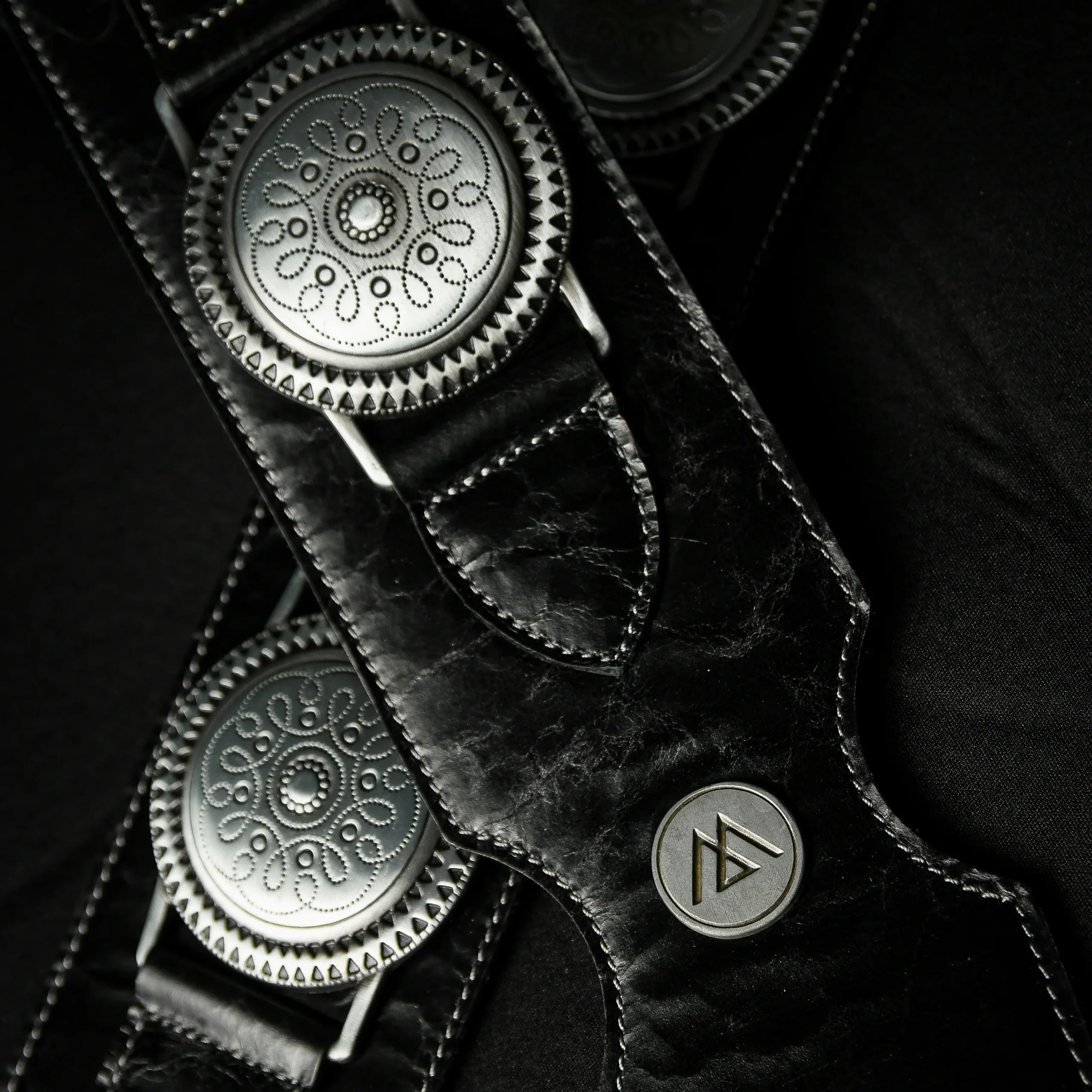 Correa artesanal de 8 cm de ancho, fabricada 100% en cuero doble. Presenta apliques metálicos tipo plato ornamental bañados en plata, que definen su carácter imponente y clásico. Ajustable de 1,10 m a 1,45 m. Robusta, cómoda y con presencia escénica inconfundible.
