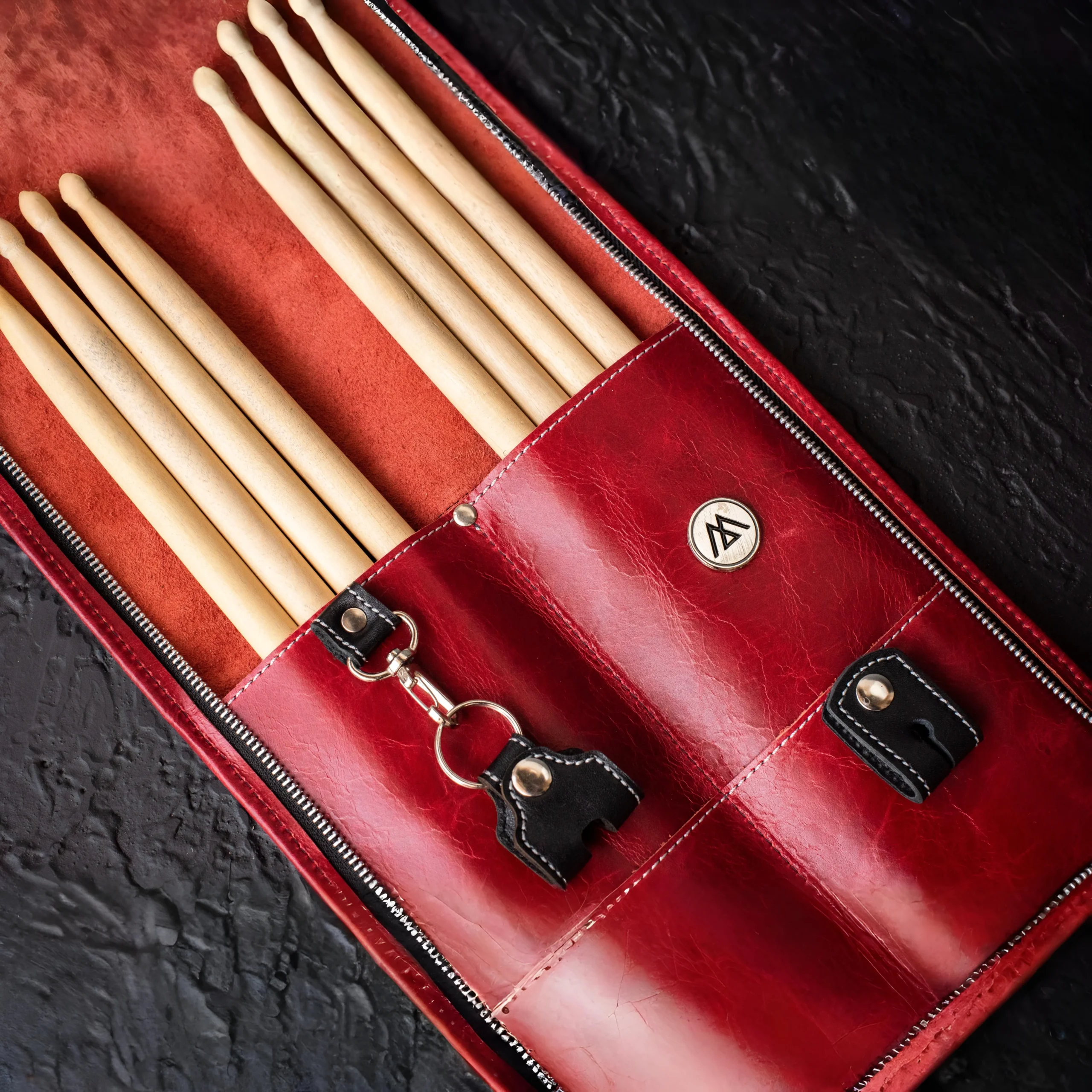 El portapalos Little en cuero rojo Ferrari está diseñado para músicos que buscan practicidad sin resignar estilo. Hecho artesanalmente con cuero real, guarda hasta 4 pares de palos y ofrece un diseño resistente y compacto. Cuenta con llavero porta afinador, cierres metálicos tanto en el exterior como en el bolsillo interno, que puede utilizarse para llevar el celular u otros esenciales. Su interior suave protege tus palos, mientras que el exterior en cuero brillante rojo aporta carácter. Cada detalle está pensado para acompañarte en cada show o ensayo.
