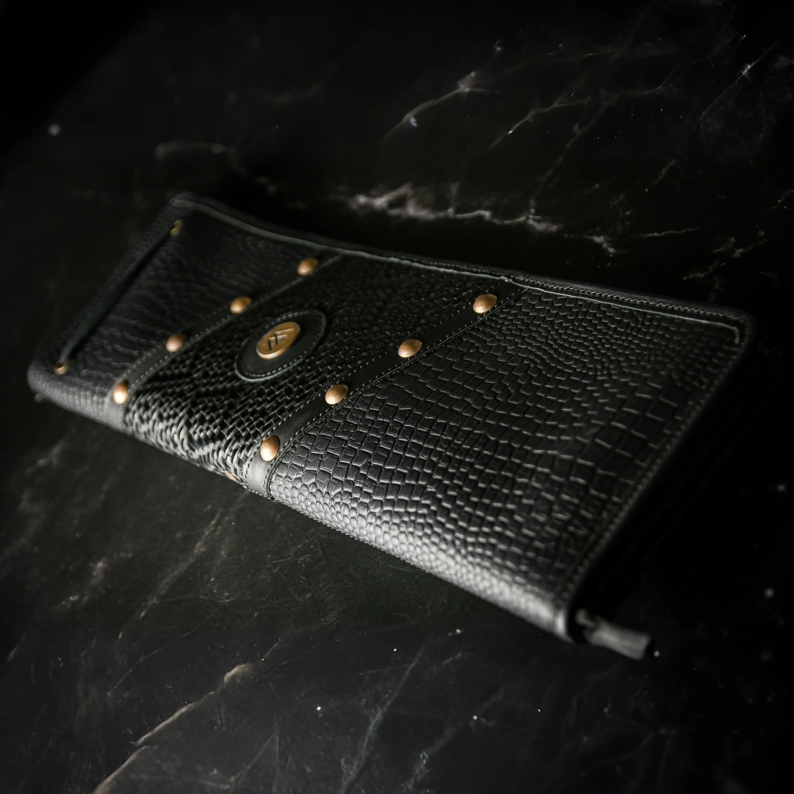 Portapalos Tyr de cuero real, ultra resistente. Disponible en dos tamaños: Little (4 pares) y Mid (8 pares). Con cierre metálico, porta afinador, bolsillo interno para celular y diseño de inspiración vikinga.