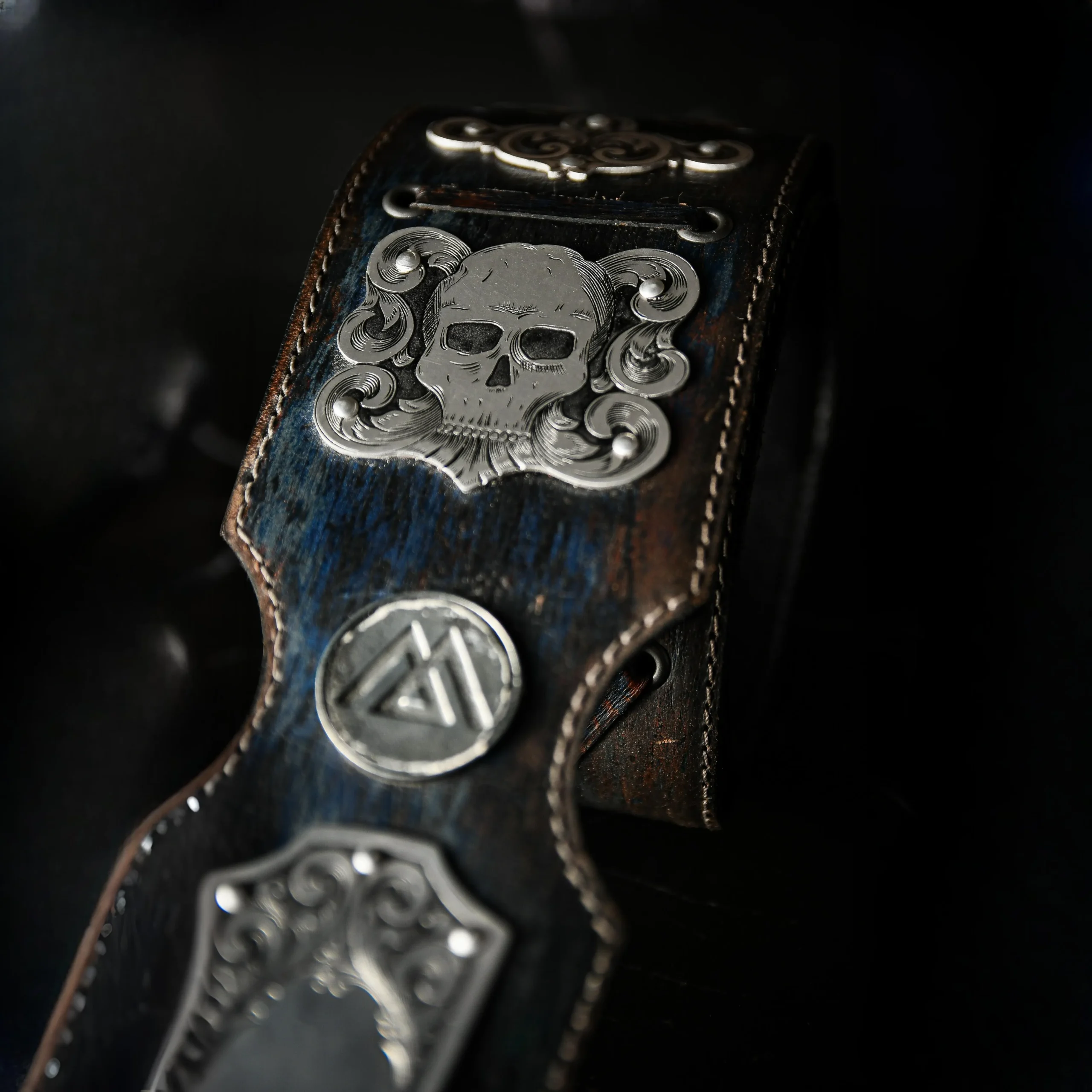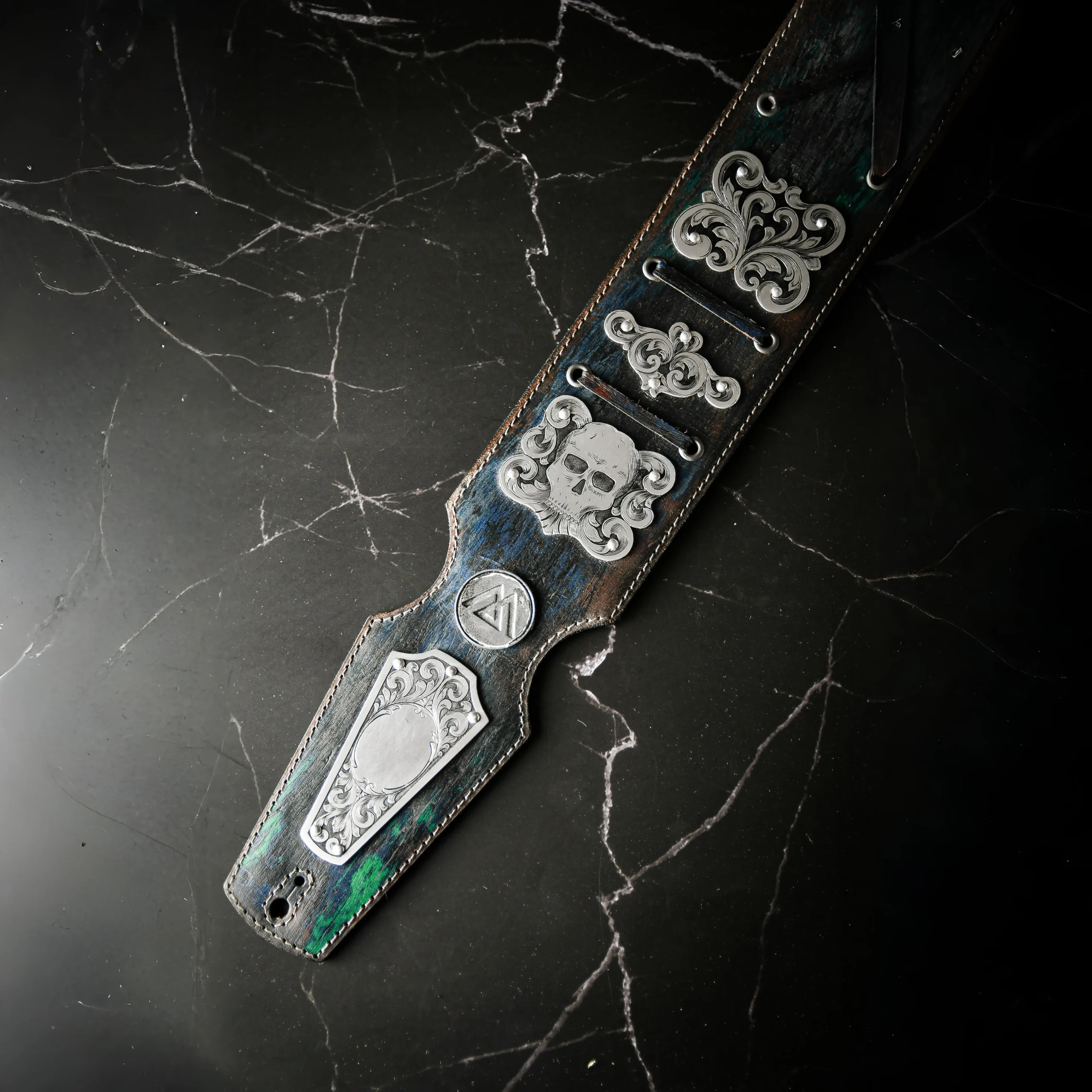 One-of-a-kind guitar strap identical to the one made for Slash. Features hand-engraved real silver plates by artisan Manuel Chapuis and a relic-treated leather base. An exclusive, unrepeatable piece loaded with history.