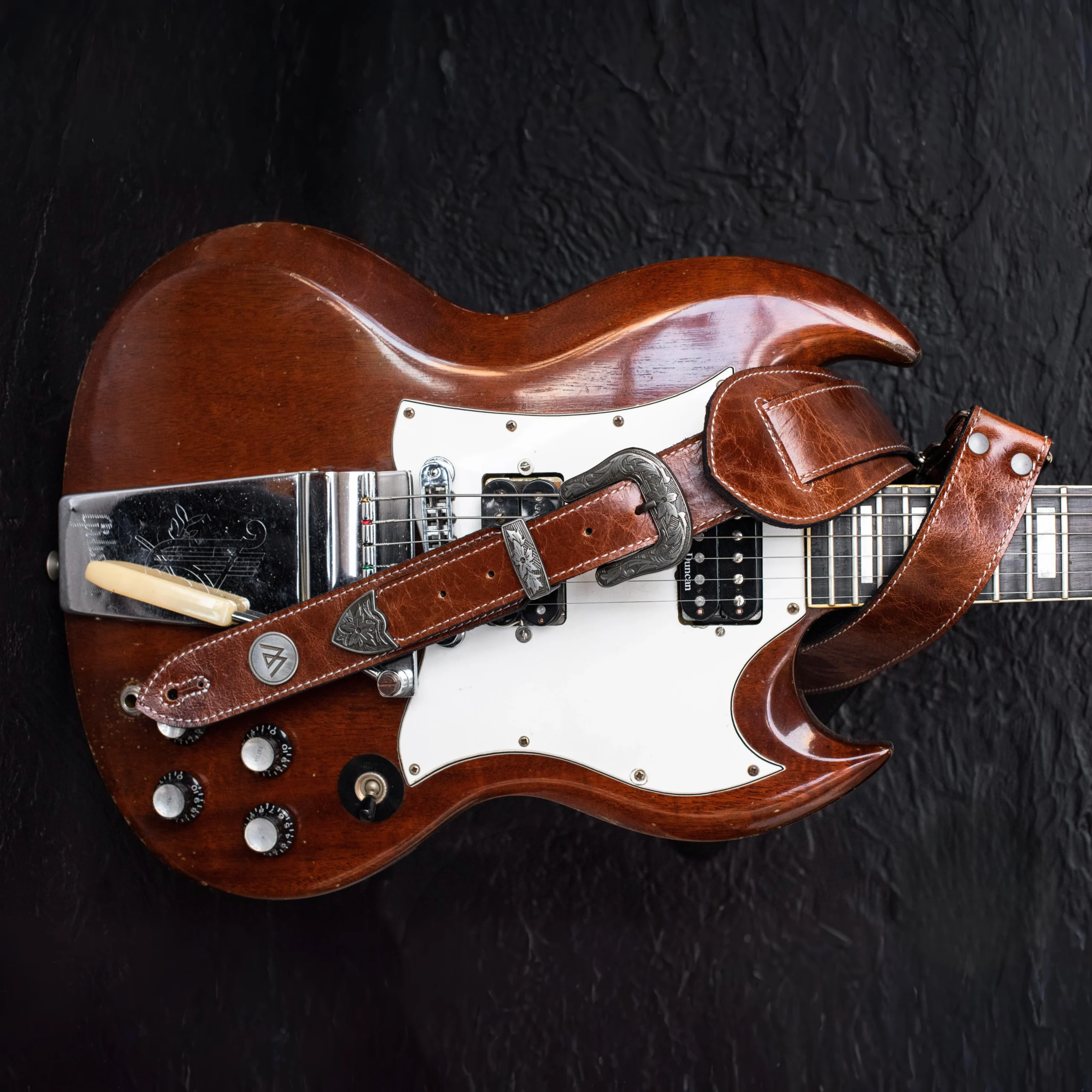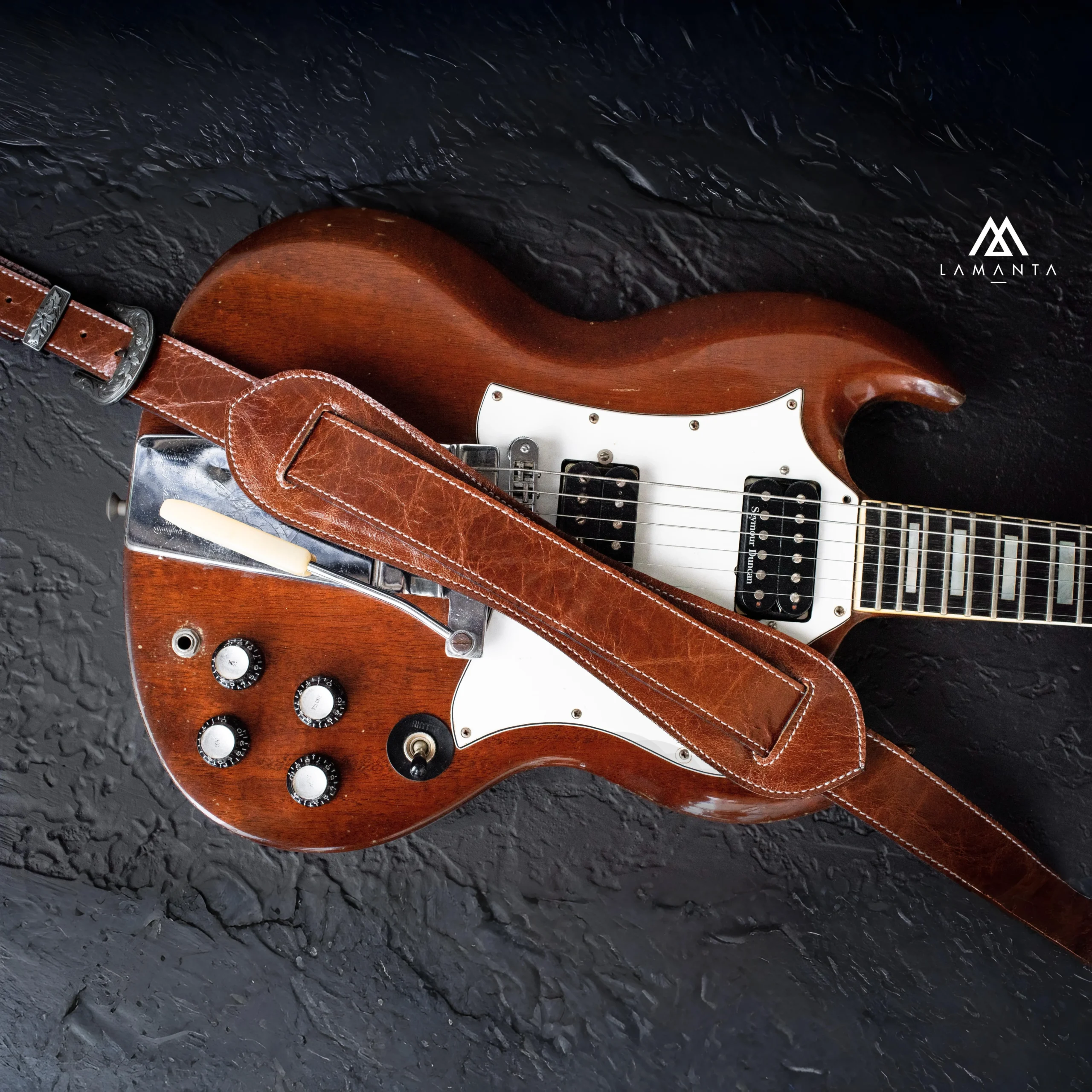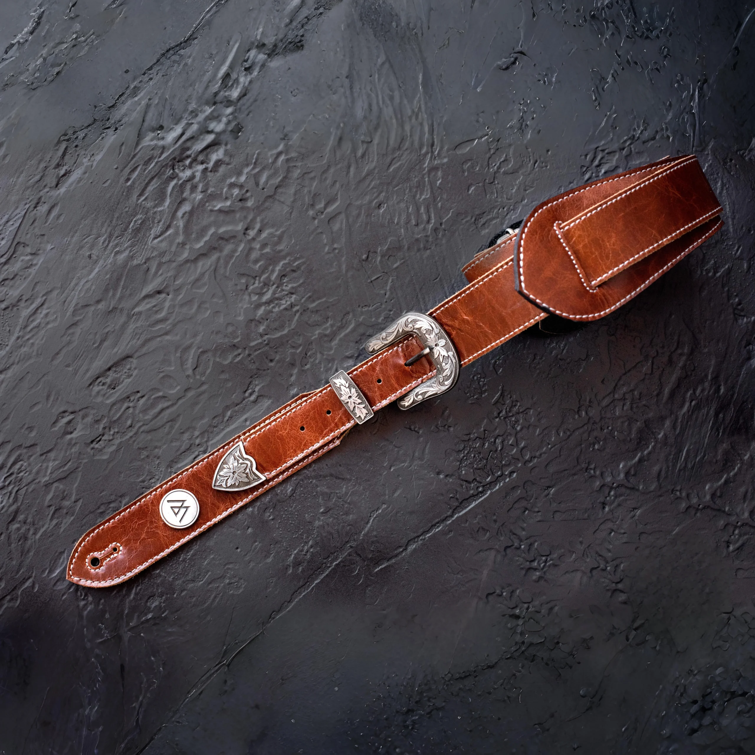 Correa de cuero de 4 cm con hombrera acolchada. Hebilla metálica estilo vaquero. Modelo Stage Leo, ideal para tocar con estilo y comodidad.