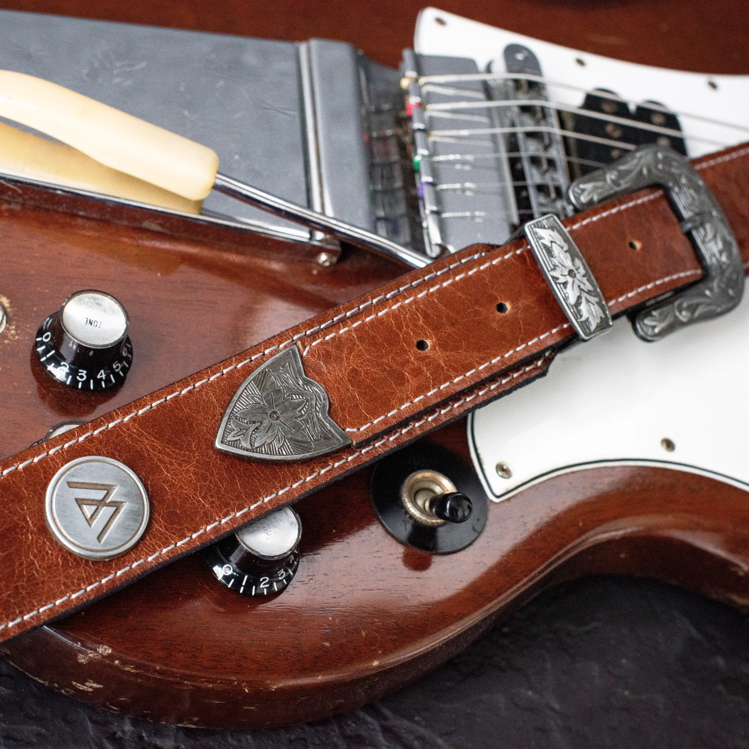 La Stage Leo es una correa de 4 cm de ancho con hombrera acolchada, ideal para quienes buscan comodidad sin resignar estilo. Fabricada en cuero natural teñido a mano con un vibrante acabado marrón y textura craquelada, se completa con una hebilla vaquera metálica y apliques con grabados ornamentales.