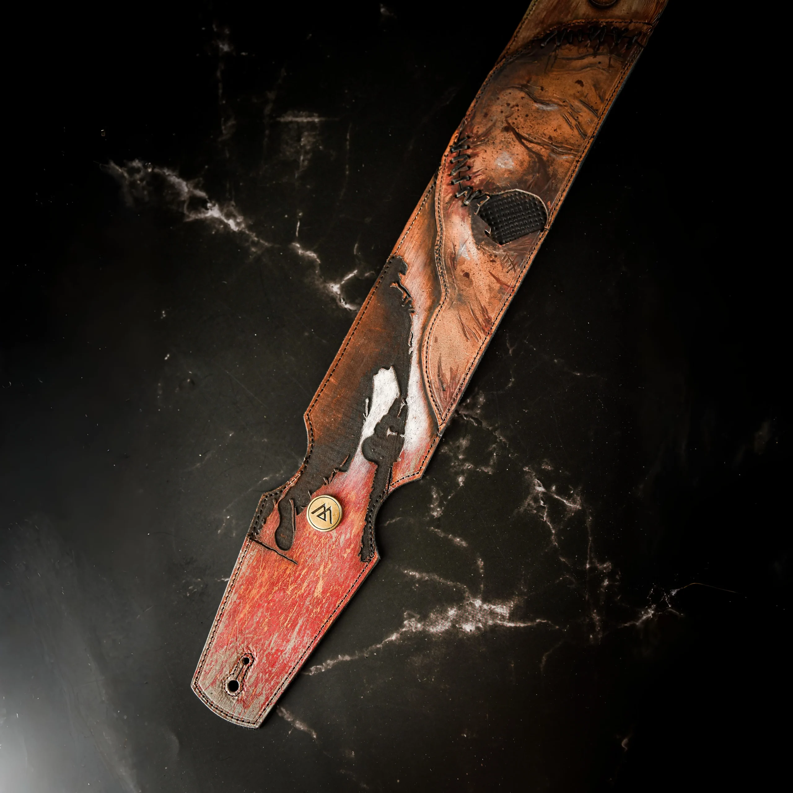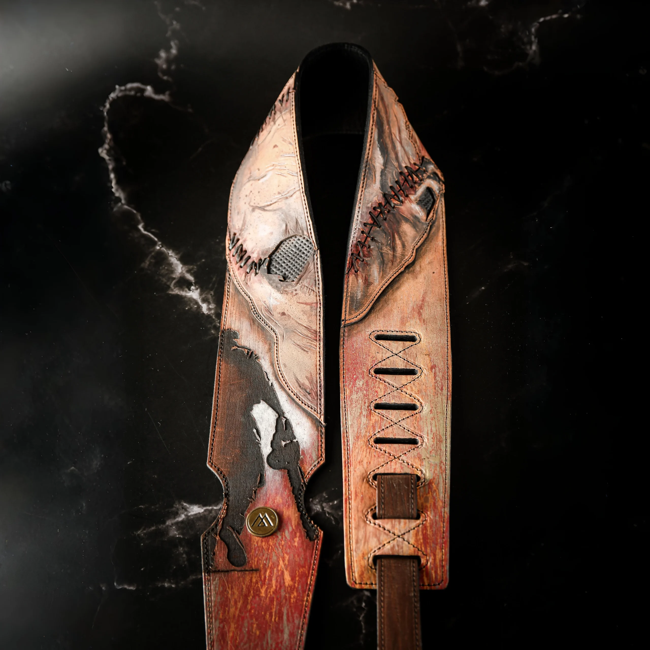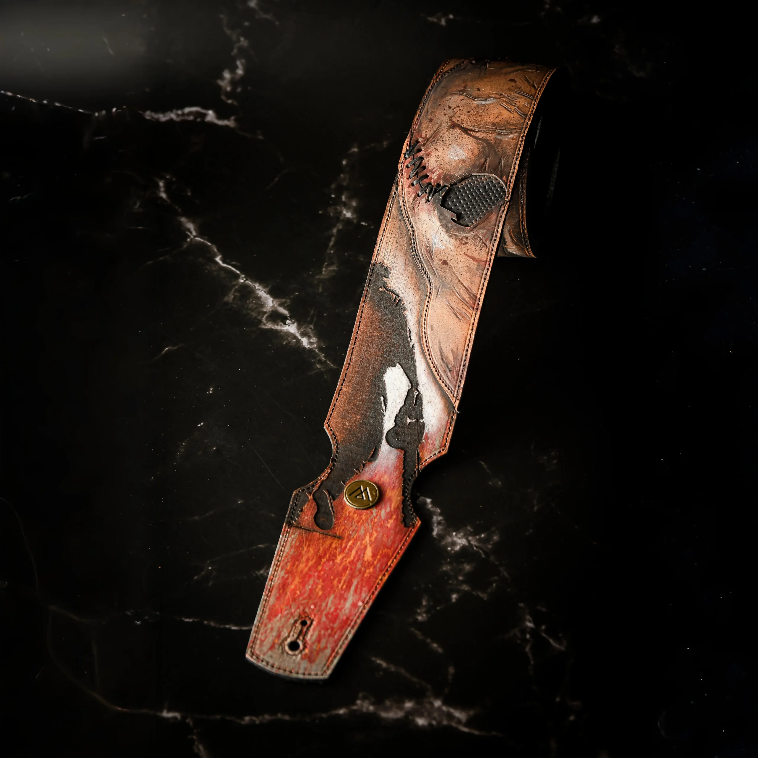 Dive into classic horror with this handcrafted guitar strap inspired by The Texas Chainsaw Massacre. Made from high-quality leather and hand-painted, it features details reminiscent of Leatherface’s stitched-together skin—rugged seams, scorched textures, and a raw, distressed look. Each strap is one-of-a-kind, capturing the film’s brutal essence while merging artistry with functionality.
