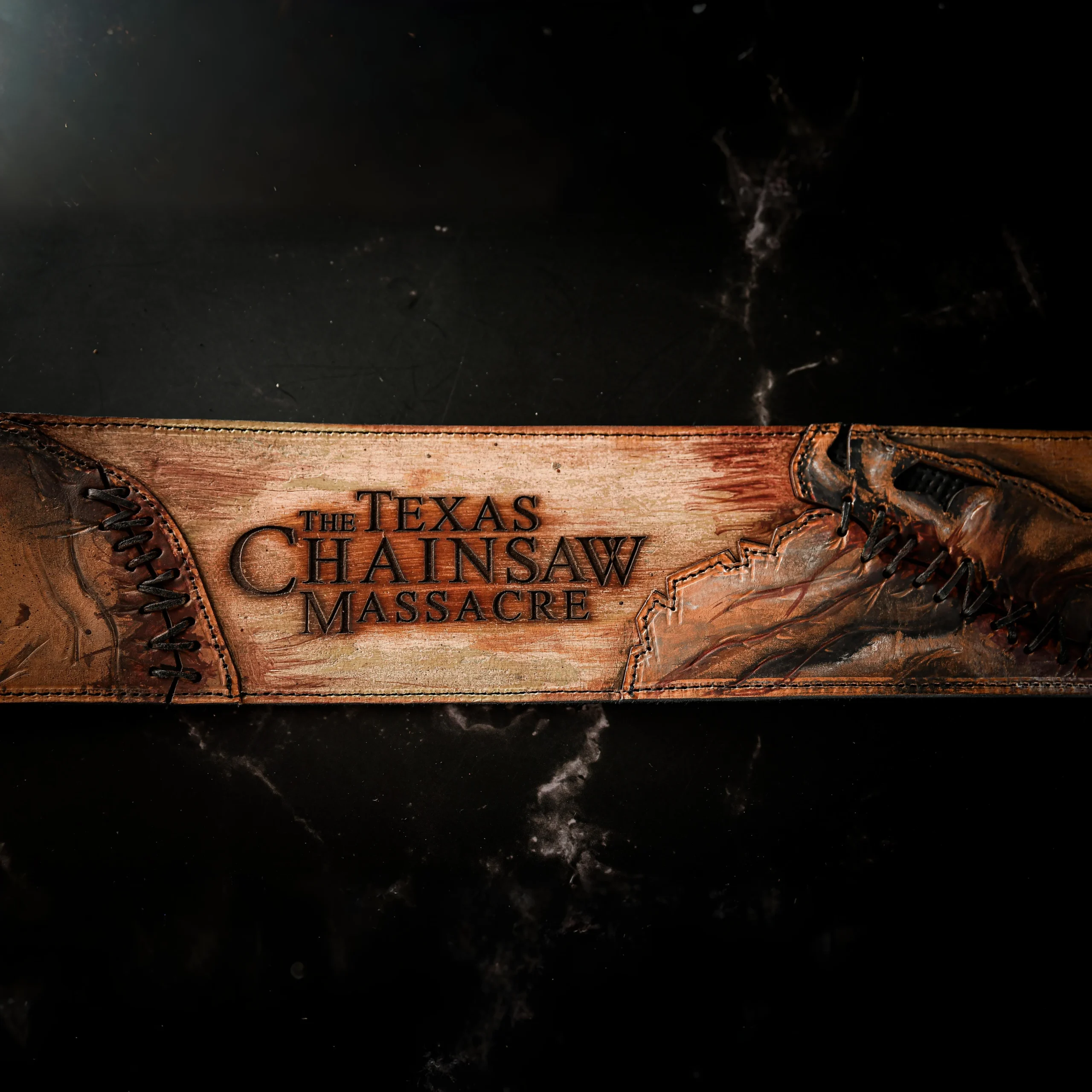 Limited edition guitar strap inspired by The Texas Chainsaw Massacre. Handcrafted leather, hyper-realistic details by a professional SFX artist, and a custom relic finish bring classic horror to life in a brutal, one-of-a-kind piece.
