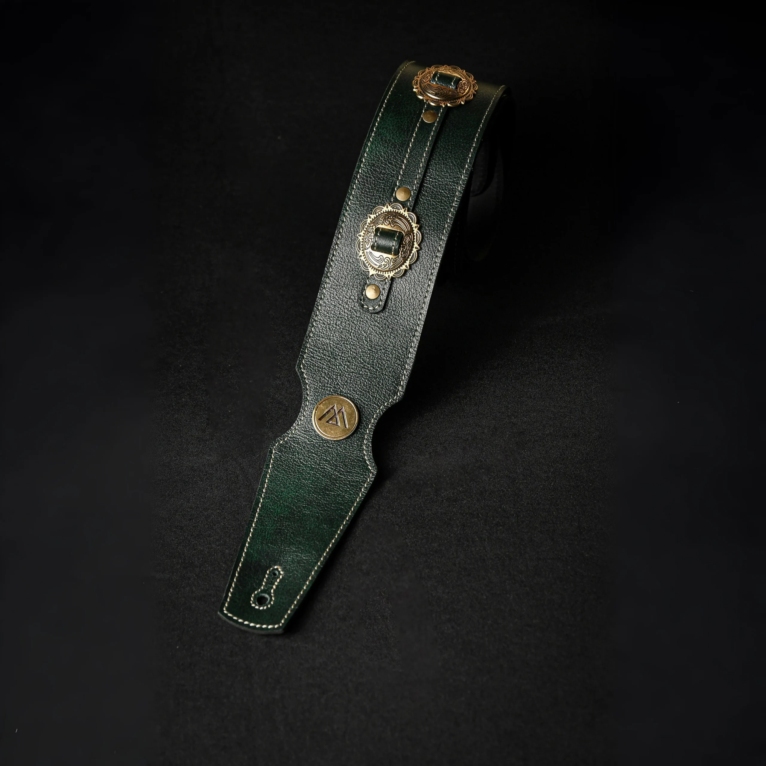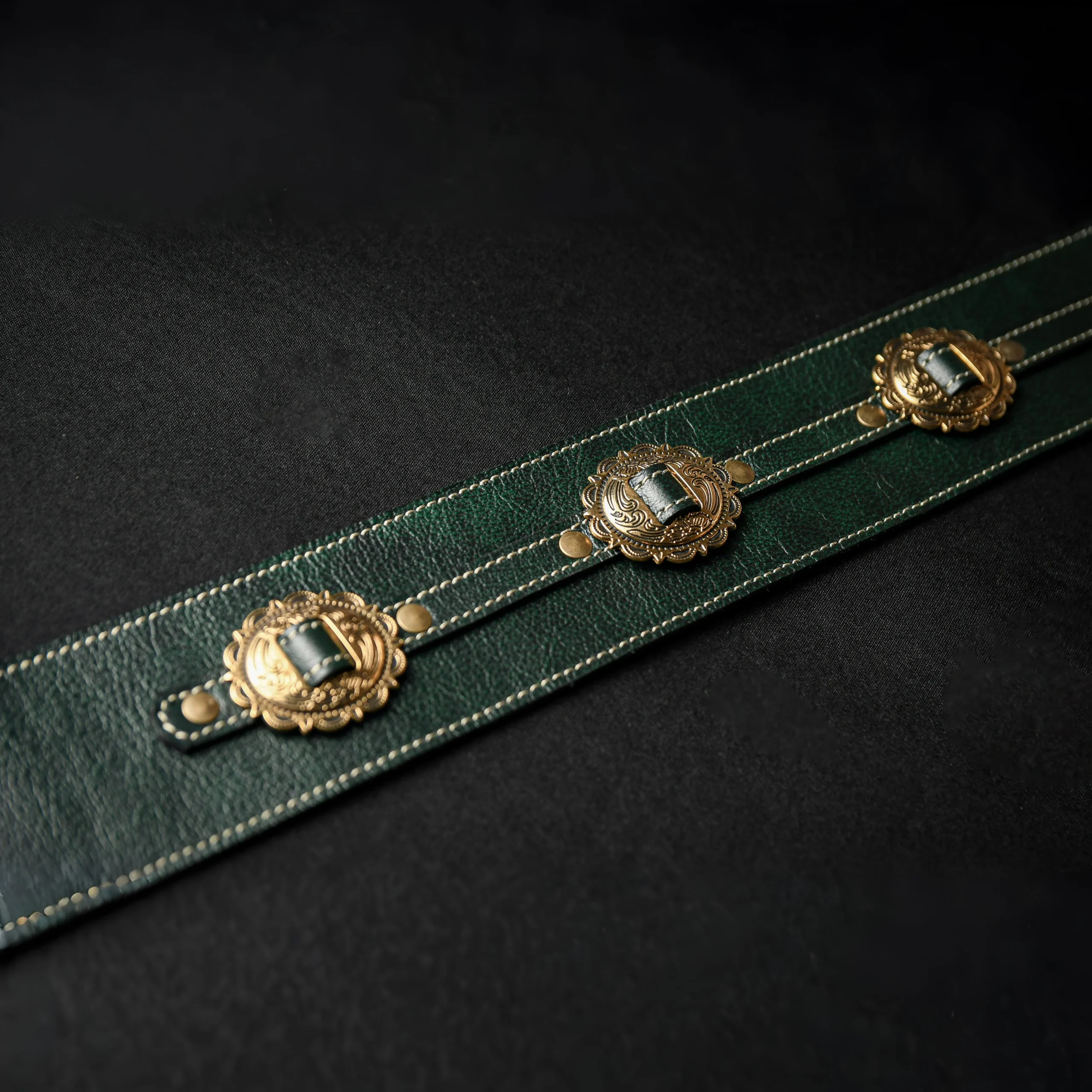 Correa de cuero verde British Racing con apliques texanos bañados en oro. Elegante, robusta y con carácter, es una pieza de 6 cm de ancho que combina tradición y estilo con un diseño artesanal único.